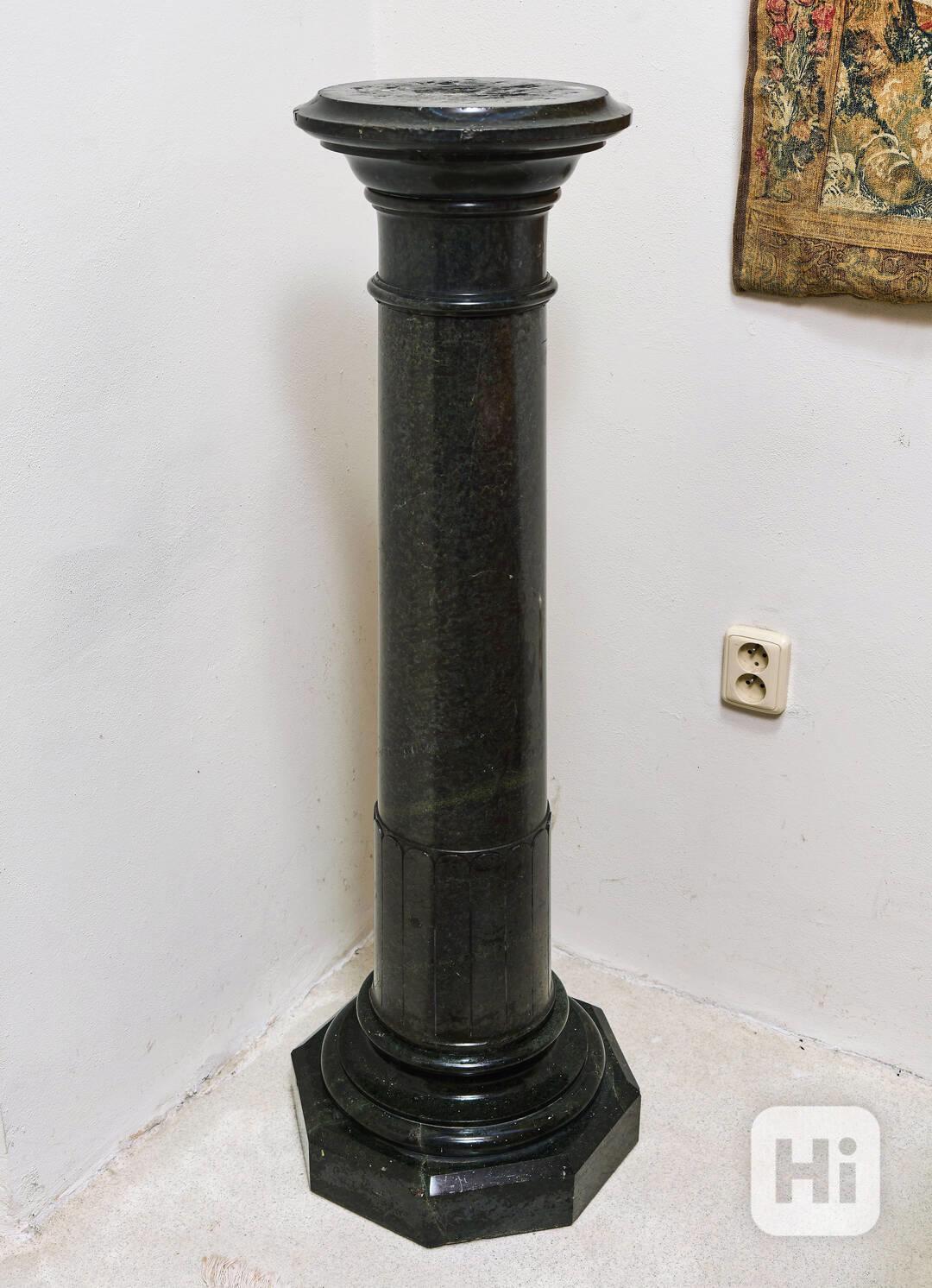Zelený mramorový starožitný sloup z francouzského zámku. V dobrém stavu. Krásná ruční kemenická práce. Není to polská ani čínská kopie. Sloup je možné pro převoz rozdělit na tři díly a tudíž ho unese i jedna fyzicky zdatná osoba. Stav: velmi dobrý, jen pár menších škrábanců a oťuků. Datace: kolem roku 1840. Provenience: Francie.